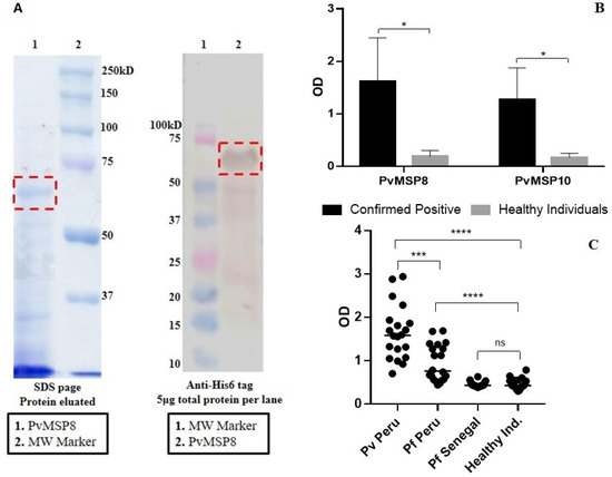 - Perez-Leal, O.; Sierra, A.Y.; Barrero, C.A.; Moncada, C.; Martinez, P.; Cortes, J.; Lopez, Y.; Torres, E.; Salazar, L.M.; Patarroyo, M.A. Plasmodium Vivax Merozoite Surface Protein 8 Cloning, Expression, and Characterisation. Biochem. Biophys. Res. Commun. 2004, 324, 1393–1399. [Google Scholar] [CrossRef] [PubMed]