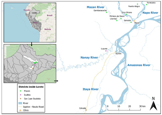 A population-based cross-sectional survey was conducted in October 2018 in seven communities of the Mazan district: Gamitanacocha (3.428° S, 73.318° W), Libertad (3.496° S, 73.234° W), Primero de Enero (3.479° S, 73.199° W), Urco Miraño (3.361° S, 73.064° W), Yuracyacu (3.365° S, 72.989° W), Salvador (3.444° S, 73.155° W) and Puerto Alegre (3.510° S, 73.116° W) (Figure 2). Transmission in Mazan is unstable and seasonal, with a peak between May and September. P. vivax cases predominates over P. falciparum ones (Pv/Pf ratio: 3.5/1). A total of 1360 malaria cases were reported in 2018 [4,24].