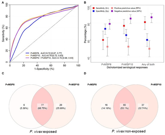 The cross-validated receiver operating characteristic (ROC) analysis showed a good performance of serological responses against PvMSP8 for detecting P. vivax recent exposure (area under the curve (AUC = 0.72 [95% CI = 0.67–0.77]), which was slightly lower than the performance of anti-PvMSP10 (AUC = 0.78 [95% CI = 0.72–0.83]; p = 0.01). The combination of both proteins in the analysis did not improve the discrimination between Pv exposed and non-exposed individuals (AUC = 0.76 [95% CI = 0.67–0.86]) (Figure 3A) [16]. Seropositivity to PvMSP8 (using the conventional cutoff of the mean plus three standard deviation of negative controls) identified individuals who acquired P. vivax infections with a moderate sensitivity (Sn) of 60.1% (95% CI = 48.8–70.6), specificity (Sp) of 73.2% (95% CI = 66.6–79.0), positive predictive value (PPV) of 52.2% (95% CI = 41.0–63.2), and negative predictive value (NPV) of 79.1% (95% CI = 72.8–84.3). Comparatively, seropositivity to PvMSP10 showed higher Sn 76.8% (95% CI = 67.4–84.2) and NPV 85.4% (95% CI = 79.3–90.0), but a lower Sp 65.8% (95% CI = 58.5–72.5), PPV was 52.2% (95% CI = 42.3–61.9). Seropositivity to any of both antigens showed a higher Sn 81.2% (95% CI = 72.4–87.7) but a lower Sp 60.2% (95% CI = 52.4–67.5), PPV was 49.8% (95% CI = 40.2–59.3) and NPV 86.8% (95% CI = 80.6–91.3) (Figure 3B). Interestingly, among all samples of individuals with confirmed P. vivax exposure and seropositivity to any of both antigens, the majority of them were seropositive to both antigens (Figure 3C). The same occurred when seropositive samples of individuals that did not have P. vivax infections were analyzed (Figure 3D)
