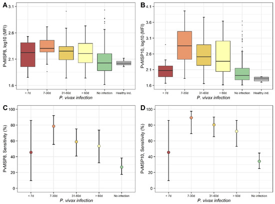Individuals with infections between seven and 30 days before plasma sample collection had the highest IgG values (log10 of median fluorescence intensity (MFI) values) against PvMSP8 (median = 2.31, and IQR = 0.22) and then this response decreased with the time since last infection, being 31–60 days (median = 2.25, and IQR = 0.25) and more than 60 days (median = 2.21, and IQR = 0.37) (Kruskal–Wallis test, p < 0.001) (Figure 4A). The pairwise comparison found that individuals with detected infections (except for individuals with infections less than seven days due to low sample numbers) had higher IgG levels than individuals without infections (post hoc Dunn’s test, p < 0.05) and that the median of this latter group (2.02 and IQR = 0.32) did not differ from healthy individuals (2.02 IQR = 0.07) (p > 0.05). IgG log10 MFI values against PvMSP10 were also higher in individuals with infections between seven and 30 days before plasma sample collection (median = 2.86, and IQR = 0.88) and also decreased with the time since last infection 31–60 days (median = 2.44, and IQR = 0.69) and more than 60 days (median = 2.33, and IQR = 1.05) (Kruskal–Wallis test, p < 0.001) (Figure 4B). Similar to PvMSP8, pairwise comparison found that with exception of infections less than seven days, all other infections had higher anti-PvMSP10 IgG levels (median 2.44 and IQR = 0.88) than individuals without infections (median 1.88 and IQR = 0.36) (post hoc Dunn’s test, p < 0.001). IgG levels against PvMSP10 in individuals with no-infection (median 1.88 and IQR = 0.36) did not differ from those in healthy individuals (1.81 IQR = 0.12) (p > 0.05).