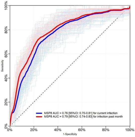 Cross-validated Receiver Operating Characteristic (ROC) curves and Areas Under the Curve (AUCs) of serological responses against PvMSP8 for detecting malaria exposure. Serological responses against PvMSP8 were measured by ELISA in a population of 1251 individuals in riverine communities in Mazan. A first definition of P. vivax exposure was a positive P. vivax result (by microscopy and/or qPCR) at the time of the sample collection (blue line), while a second definition included individuals with a positive result and/or the antecedent of P. vivax malaria in the past month (red line). No significant difference between results was found (p > 0.05).