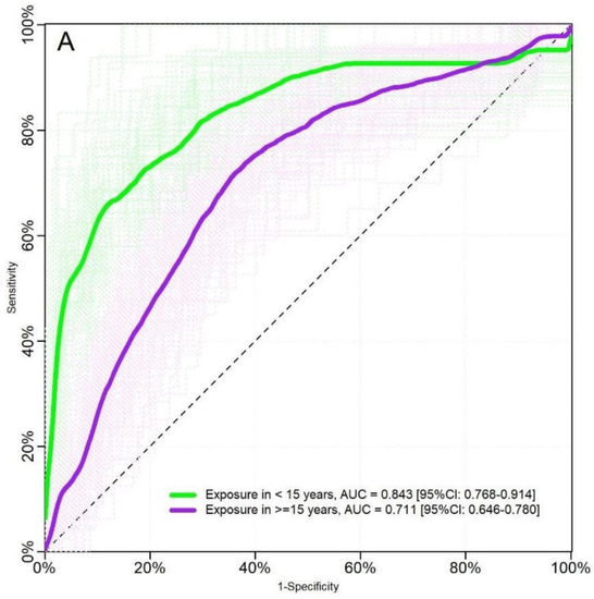 Cross-validated Receiver Operating Characteristic (ROC) curves and Areas Under the Curve (AUCs) of serological responses against PvMSP8 for detecting P. vivax malaria exposure among individuals < 15 years old and among those >15 years old. Significant difference between results were found (p = 0.01). Exposure was defined as a confirmed P. vivax diagnosis by qPCR and/or microscopy and the antecedent of P. vivax malaria in the past month (second definition).