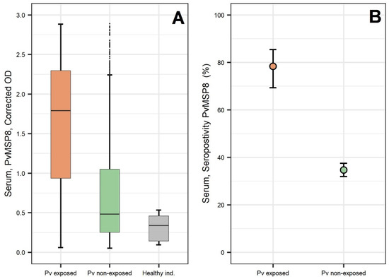Corrected anti-PvMSP8 ODs were significantly higher in exposed individuals (median = 1.78, and IQR = 1.37) when compared to individuals without exposure (median = 0.48, and IQR = 0.80), and healthy individuals (median = 0.34, and IQR = 0.32) (Kruskal–Wallis test, p < 0.001). Similarly, seropositivity to PvMSP8 was significantly higher in the exposed group (77%, 95% CI = 67–84) when compared to the unexposed group (31%, 95% CI = 29–34) (p < 0.001) (Figure 7).