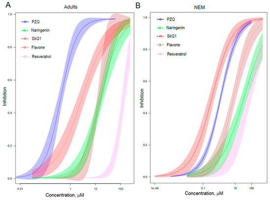 The concentration-dependent inhibitory activity of resveratrol, 10-(6′-plastoquinonyl)decyltriphenylphosphonium (SkQ1), praziquantel (PZQ), naringenin and flavone against the motility of the adult (A) and newly excysted metacercariae (NEM) (B) O. felineus liver flukes. Four-parameter logistic regression was used to calculate the half-maximal effective dose (IC50) and 95% confidence interval (‘drc’ R 3.6.0 package).