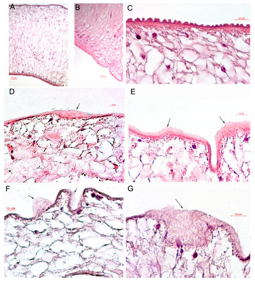 Tegument structure of adult worms at 1 day after the treatment. (A–C). Adult worm tegument after dimethylsulfoxide (DMSO) treatment. (D,E) Swelling of the tegument of adult worm, treated with 1 µM praziquantel (PZQ). (F,G) Swelling and sloughing of the tegument of adult worm, treated with 10 µM 10-(6′-plastoquinonyl)decyltriphenylphosphonium (SkQ1). Five helminths from each group of treatment were analyzed. Representative pictures are shown.