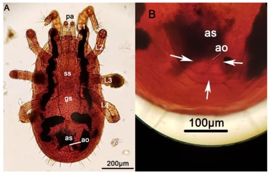 Figure 2. Ventral view of a female Dermanyssus gallinae mite under the light microscope at (A) 100× magnification and (B) 400× magnification, detail of the anal shield. Terminology based on keys described by Moss et al. [28,29] and Di Palma et al. [30]: as: anal shield; ao: anal opening; gs: genitoventral shield; ss: sternal shield; L1–4: leg pairs; pa: palp. The arrows pinpoint at the three anal setae.