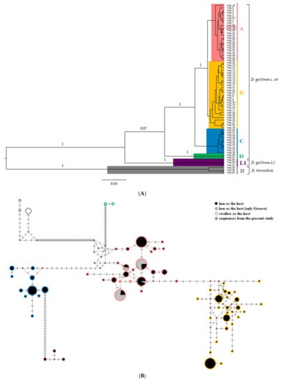 The Bayesian phylogenetic analysis (Figure 3A) and the median-joining network (Figure 3B) supported the identification of three haplogroups as regards clustering haplotypes coming from mites D. gallinae sensu stricto isolated from hens. Haplogroup A contains 23 haplotypes from 10 countries, including the unique haplotype identified in the present study. All mite haplotypes (n = 5) previously identified in Greece from Karp-Tatham et al. [32], corresponding to 61 sequences, are also grouped in this cluster. Haplogroup B includes 27 haplotypes from 8 different countries. Finally, haplogroup C includes 10 haplotypes coming from 7 countries. The haplotypes of D. gallinae isolated from swallows clustered in one distinct haplogroup (D), which was separated by several mutational steps (n = 32) by the other haplogroups of the species. The special lineage L1 contains haplotypes from D. gallinae mites isolated only from pigeons. The haplotypes of D. hirundinis construct one more distinct haplogroup (H). According to the median-joining network, the two species (D. gallinae sensu stricto and D. hirundinidis) are separated by 55 mutational steps. All accession numbers and countries of origin for each haplotype used in the current study are presented in Table S1.