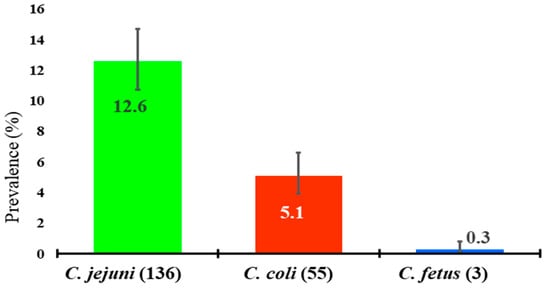 In this study, among the 194 isolates, 70.1% (n = 136), 28.4% (n = 55), and 1.5% (n = 3) were confirmed as C. jejuni, C. coli, and C. fetus, respectively. The distribution of C. jejuni, C. coli, and C. fetus were captured as 12.6% (95% CI: 10.7–14.7%), 5.1% (95% CI: 3.9–6.6%), and 0.3% (95% CI: 0.1–0.8%), respectively, in the different samples (Figure 1).