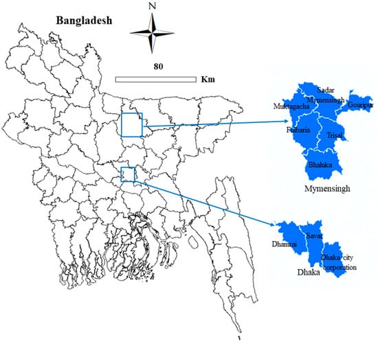 Location of study districts (Mymensingh and Dhaka). A total of six sub-districts (Mymensingh Sadar, Muktagacha, Gouripur, Fulbaria, Trisal, and Bhaluka) of the Mymensingh district and two sub-districts (Dhamarai and Savar) and the Dhaka City Corporation (DCC) area of the Dhaka district were included in this study.