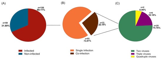 The prevalence of single infection and coinfection among the pilgrims, (A) pie chart shows the numbers (n) and percentages (%) of infected (red) and non-infected (blue) individuals relative to total number of pilgrims (n = 185). (B) Represents the numbers (n) and percentages (%) of single infection (orange) and coinfection (brown) cases among infected pilgrims (n = 126). (C) The numbers (n) and percentages (%) of two (green), triple (purple), or quadrable (yellow) viruses relative to the number of co-infection cases (n = 33).