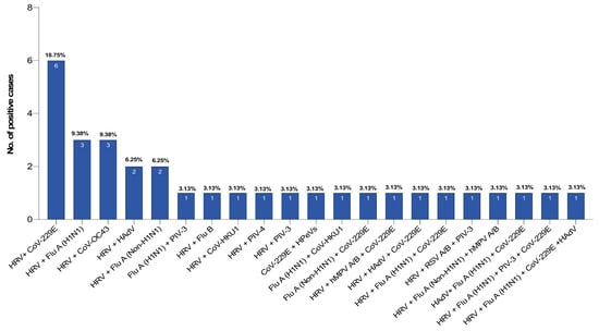 Pattern of coinfection cases among pilgrims during the 2019 Hajj season, the most common coinfections were due to the HRV with CoV-229E (18.75%), then with influenza A (H1N1) or CoV-OC43 (9.38%), with influenza A (non-H1N1) or human adenovirus (6.25%) followed by others viral combinations (3.13%).