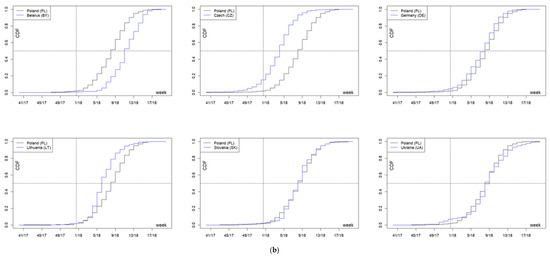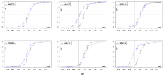 In the 2016/2017 season, the onset time median in the analyzed countries fell between week 52 of 2016 (52/16, 12 December 2016–1 January 2017) in Ukraine, and week 5 of 2017 (5/17, 30 January–5 February 2017) in Slovakia and Germany. The interquartile range varied from three weeks in Poland to five weeks in Ukraine and the Czech Republic. The distribution of incidence over time in Poland differed in a statistically significant manner from that observed in the other countries (in all cases p < 0.001)—cumulative distribution functions (Figure 5a). In Poland, cases of the disease occurred on average in the 4th week of 2017 (4/17, 23–29 January 2017), i.e., later than in Ukraine; in the Czech Republic—in the 1st week of 2017 (1/17, 2–8 January 2017); and in Lithuania—in the 3rd week of 2017 (3/17, 16–22 January 2017), but earlier than in Germany and Slovakia. The difference in distributions between Poland and Belarus is not due to the average onset time (in both countries the 4th week of 2017), but to the fact that the season in Belarus lasted much longer (Figure 5a, Table 1).
