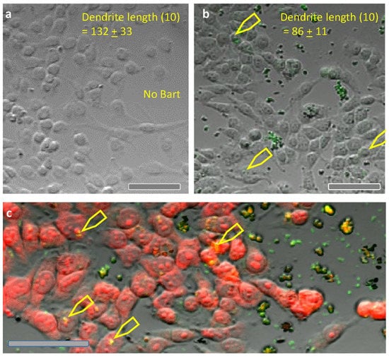 Bartonella henselae is an intracellular bacterium that induces expression of VEGFC [35,36,37]. Additionally, Bartonella spp. are known to cause vasoproliferative lesions in the human host [38]. A co-culture model was developed to determine if B. henselae altered the biological behavior of cultured melanoma cells (Figure 2b). Melanoma cells inoculated with a live culture of B. henselae American Type Culture Collection (ATCC), # 49882, Houston-1), had shorter dendritic processes as compared to non-infected melanoma cells (Figure 2a).