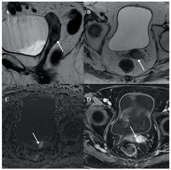 Pelvic magnetic resonance imaging (MRI). An infiltrative cervical mass (arrow) is seen in axial (A) and sagittal (B) T2 weighted MRI with stromal infiltration as a disruption of the cervical stroma hypointensity and focal infiltration of superior vaginal third (arrow in A). The lesion showed restricted diffusion in high b value (C: DWI b 800) and contrast enhancement (D: Post-contrast axial T1w fat saturated MRI).