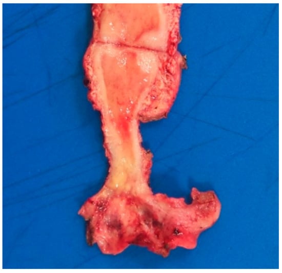 A total hysterectomy was performed due to clinical suspicion of cervical cancer. Macroscopically, the cervix showed a yellowish and indurated lesion with poorly delimited margins, involving the whole uterine cervix and extending focally to the upper vagina (Figure 3).