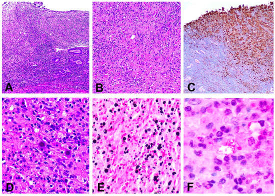 (A) Inflammatory infiltrate replacing the lamina propria and ulcerating the superficial epithelium (hematoxylin and eosin, 40×); (B) Histiocytic infiltrate in the cervical stroma (hematoxylin and eosin, 200×); (C) Immunohistochemical stain for CD68 showing a dense infiltrate composed by macrophages (immunohistochemical stain anti CD68); (D) Abundant Michaelis–Gutmann bodies (hematoxylin ad eosin 200×); (E) Presence of intra and extracytoplasmic Michaelis–Gutmann bodies positive for von Kossa stain (100×); (F) Escherichia coli bacilli present inside the cytoplasm of histiocytes (immunohistochemical stain anti E. coli, 600×).
