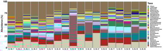 Relative abundance of bacterial genera detected in 18 camel blood samples. Each bar represents the bacterial taxa detected in one camel sample. The sample ID is provided on the bottom of each bar.
