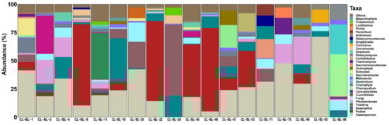 Relative abundance of eukaryotic genera detected in 18 camel blood samples. Each bar represents the eukaryotic taxa detected in one camel sample. The sample ID is provided on the bottom of each bar.