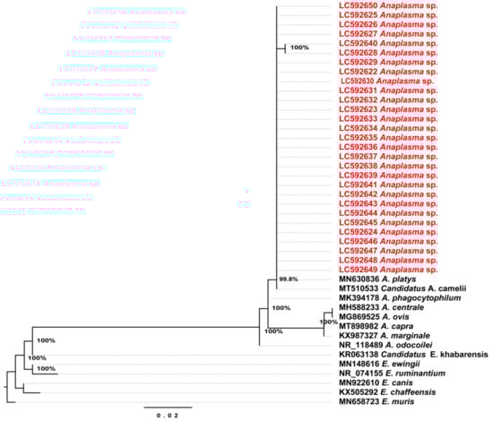 Phylogenetic tree based on the 16S rDNA sequences of Anaplasma and Ehrlichia. The tree was constructed by the maximum likelihood (ML) method based on the HKY85 model (Hasegawa–Kishino–Yano, 85) and site heterogeneity model (Invariant Sites) using the PhyML program. Numbers at the nodes are bootstrap values supported from 1000 replications. The scale bar represents 0.02 nucleotide substitutions per nucleotide site. Red font labels indicate GenBank accession numbers of 16S rDNA of Candidatus Anaplasma camelii sequences obtained in this study. The tree was rooted to Ehrlichia muris (MN658723).