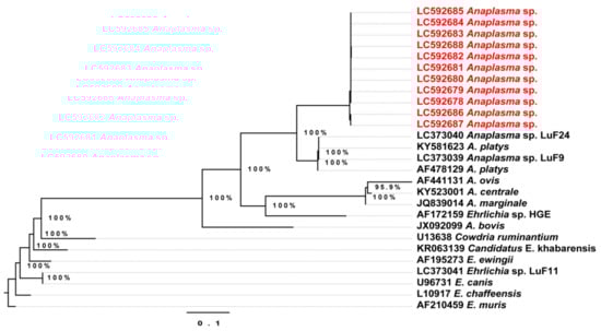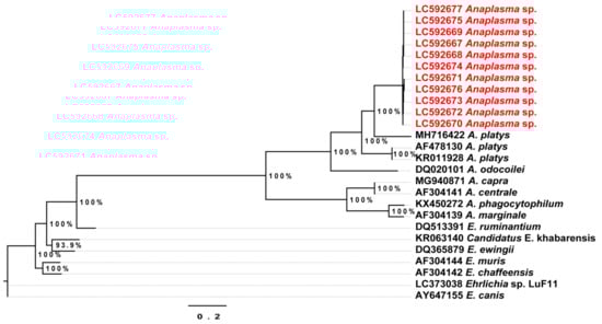 The partial sequences of the heat-shock protein (groEL) gene obtained from 11 Anaplasma-positive samples showed 99–100% identity to each other. These sequences showed 88.3% and 86.3% identity to A. platys (MH716435) found from a Rhipicephalus microplus tick from China and (CP046391) and a dog in Saint Kitts and Nevis, respectively. The obtained sequences were all clustered together in a separate clade from other Anaplasma spp. in the ML phylogenetic analysis (Figure 5).