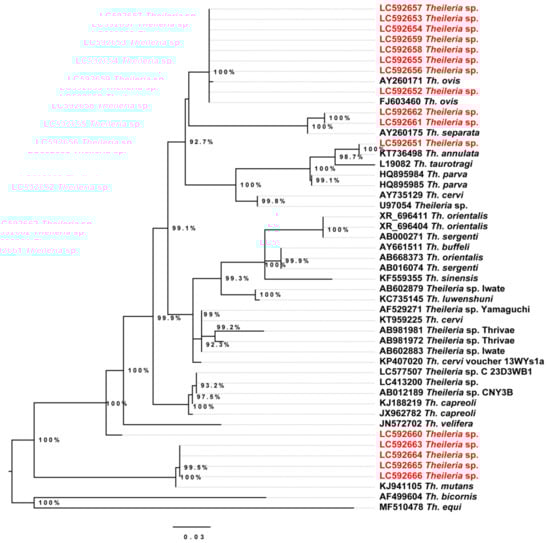 Phylogenetic tree based on the 18S rDNA sequences of Theileria. The tree was constructed by the maximum likelihood method based on the GTR (general time reversible) model and site heterogeneity model (Gamma + Invariant Sites) using PhyML program. Numbers at the nodes are bootstrap values supported from 1000 replications. The scale bar represents 0.03 nucleotide substitutions per nucleotide site. Red font labels indicate GenBank accession numbers of the 18S rDNA sequences of Theileria spp. obtained in this study. The tree was rooted to Theileria equi (MF510478).