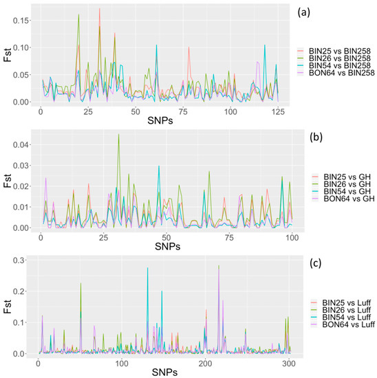 - De Villemereuil, P.; Gaggiotti, O.E. A new Fst-based method to uncover local adaptation using environmental variables. Methods Ecol. Evol. 2015, 6, 1248–1258. [Google Scholar] [CrossRef]