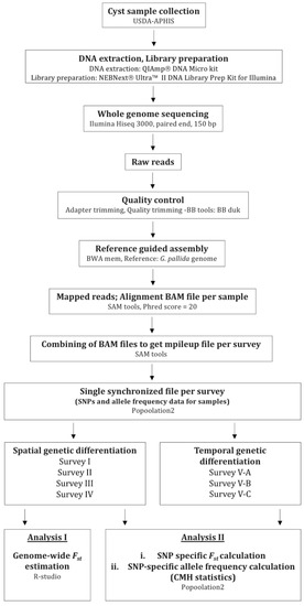 - Mimee, B.; Duceppe, M.O.; Veronneau, P.Y.; Lafond-Lapalme, J.; Jean, M.; Belzile, F.; Belair, G. A new method for studying population genetics of cyst nematodes based on Pool-Seq and genomewide allele frequency analysis. Mol. Ecol. Resour. 2015, 15, 1356–1365. [Google Scholar] [CrossRef]