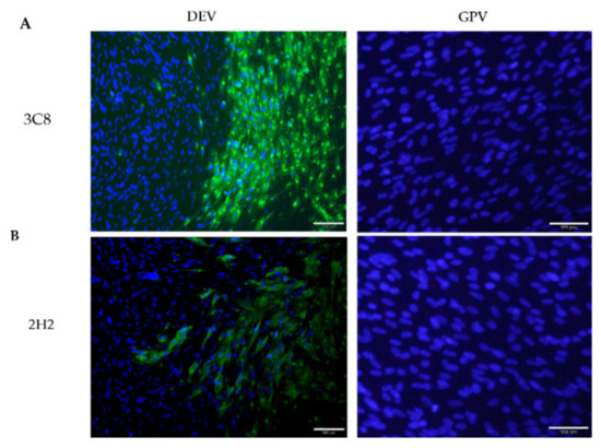 Indirect immunofluorescence staining of duck enteritis virus (DEV) and goose parvovirus (GPV) infected duck embryo fibroblasts with monoclonal antibodies 3C8 (A) and 2H2 (B) visualized with Dylight®488 (green signal). The blue signal represents nuclei counterstained with DAPI.