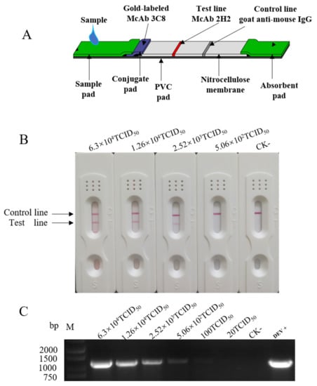 Analytic sensitivity test of the immunochromatographic assay (ICA). (A) Schematic diagram of the ICA test. The monoclonal antibody (MAb) 3C8 was conjugated with colloidal gold particles (in blue); the MAb 2H2 was used as a capture antibody in the test line (in red). Goat anti-mouse IgG was used in the control line. The sample pad and absorbent pad were placed with a 1–2 mm overlap on either end of the nitrocellulose (NC) membrane. (B) Sensitivity of the ICA. (C) Sensitivity of the PCR. A total of 1 × 104.5 TCID50/100 μL of the duck enteritis virus (DEV) suspension was serially diluted in five-fold dilutions ranging from 5 × 101–5 × 106. CK-, negative control.
