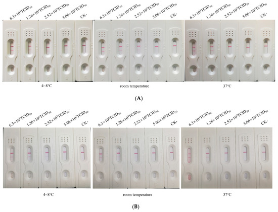 To evaluate the stability of the ICA strip during storage, the test strips were stored in closed plastic packaging at 4–8 °C, room temperature or 37 °C. The strips retained their initial reactivity and detection limit for cell culture virus suspensions after six months storage at 4–8 °C and room temperature (Figure 5A) whereas the detection limit of strips stored at 37 °C declined to 1.26 × 104 TCID50 /mL after three months (Figure 5B). These results indicated that the test strips remained stable at 4–8 °C or at room temperature after six months of storage.