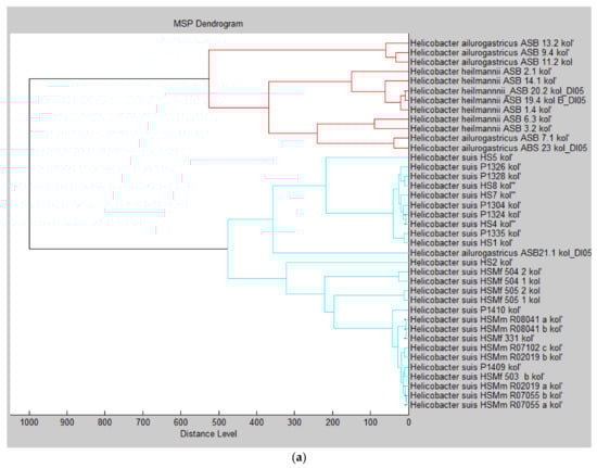 In recent years, matrix-assisted laser desorption/ionization–time-of-flight–mass spectrometry (MALDI-TOF MS) has been introduced as an accurate, rapid, and inexpensive tool for microbial identification and diagnosis [22,23,24]. This technique is based on the generation of complex fingerprints of specific biomarker molecules by measuring the exact mass/charge ratio of peptides and proteins and might be an alternative method to identify and differentiate Helicobacter species [25]. MALDI-TOF MS is also increasingly used in polyphasic taxonomic approaches when describing new bacterial species [26]. Recently, three novel Helicobacter species (i.e., H. labacensis, H. mehlei, and H. vulpis) from the gastric mucosa of red foxes were described using this approach [16]. Inadequate MALDI-TOF MS identification may occur due to the incompleteness of mass spectrometry databases [27]. For example, the current MALDI Biotyper reference database library (Bruker Daltonics, Bremen, Germany) only contains 24 Helicobacter entries, most of which are enterohepatic Helicobacter species (i.e., H. canadensis (1), H. canis (2), H. cholecystus (1), H. cinaedi (2), H. fennelliae (1), H. pullorum (9)) and only a few are gastric species (i.e., H. mustelae (1) and H. pylori (7)). In order to establish a more accurate Helicobacter species identification by MALDI-TOF MS, we generated main spectrum profiles from all available gastric Helicobacter species in our lab, resulting in an in-house Helicobacter database. The presence of a robust MALDI-TOF MS database, as provided by this research, is a prerequisite for future MALDI-TOF MS analysis on clinical samples, enabling rapid diagnosis of gastric Helicobacter infections.