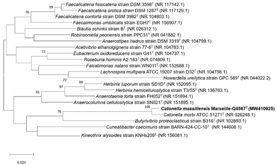 | 1 Catonella massiliensis Marseille-Q4567T | 100.00 | 28.4 [26.1–30.9] | 27.0 [24.6–29.5] | 26.0 [23.7–28.5] | 24.8 [22.5–27.3 | 24.7 [22.3–27.1] | 24.60 [22.3–27.1] | 24.5 [22.2–27] | 23.80 [21.5–26.2] | 22.9 [20.6–25.3] |