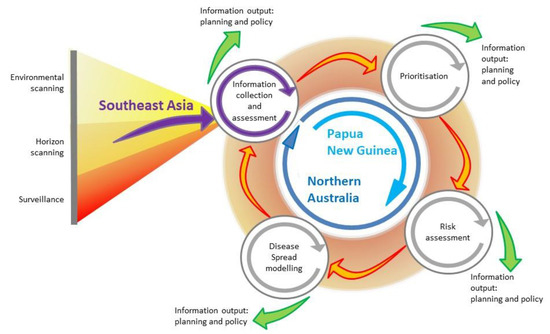 Emerging infectious disease preparedness framework, integrating surveillance, horizon and environmental scanning, prioritisation, risk assessment and disease modelling (modified from [14]). The framework illustrates information collection and assessment from Southeast Asia, and the activities undertaken in Papua New Guinea and northern Australia, in a program of research for rabies preparedness in the Oceanic region.