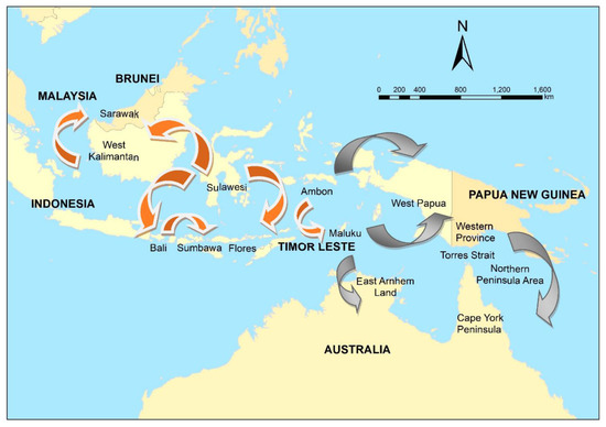 Although formal foresighting activities were not conducted, this emergence of rabies in previously free regions in eastern Indonesia prompted a re-evaluation of the risk to the Oceanic region [58]. The risk of a rabies incursion in northern Australia was assessed qualitatively using expert opinion in 2012 [59] based on the probability of entry (proximity to Indonesia and fishing, trade, and cultural travel routes) and potential impacts along the coastline (presence of communities in which domestic dogs free-roamed). Sparkes et al. [60] summarised potential incursion scenarios in two high priority regions—East Arnhem Land in the Northern Territory, and the Northern Peninsula Area (NPA) in Far North Queensland (potentially via currently rabies-free Papua New Guinea (PNG) and the Torres Strait)(Figure 2). Entry pathways included the illegal importation of rabid dogs travelling on boats engaged in Australian—South East Asian cross-cultural traditions, unauthorised fishing vessels, and itinerant yachts (Figure 2).