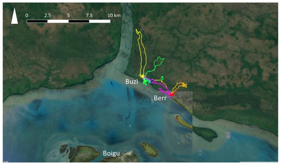 GPS trajectories from the collars of six owned, domestic dogs (each represented by a different colour) in Buzi and Berr villages, Western Province, Papua New Guinea.