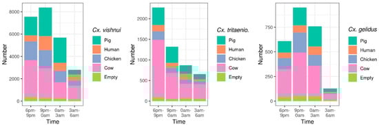 Mosquito abundance of the three main species Culex vishnui, Culex tritaeniorhynchus and Culex gelidus on different baits (pig, human, chicken, cow and empty) at different time of collection during the night (every 3 h from 6 p.m. to 6 a.m.). Y-axis have different scales.