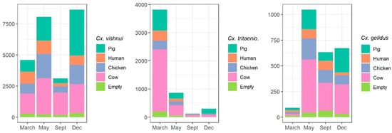 Mosquito abundance of the three main species Culex vishnui, Culex tritaeniorhynchus and Culex gelidus on different baits (pig, human, chicken, cow and empty) during the 4 trapping months (March, June, September and December). Y-axis represents the total number of collected mosquitoes. Y-axis have different scales.