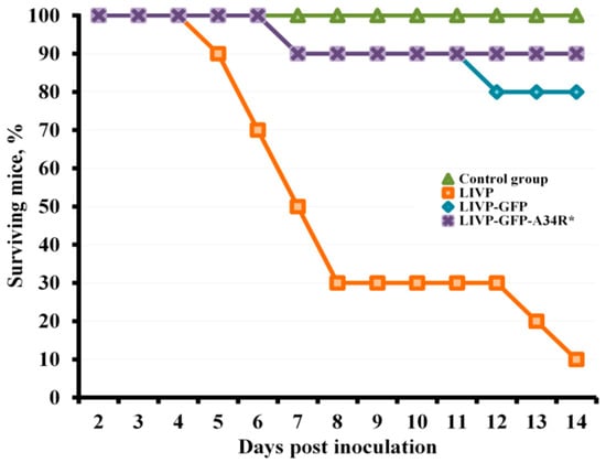 Groups of 2–3-day-old BALB/c suckling mice (10 animals each) were intracerebrally (i.c.) inoculated with LIVP, LIVP-GFP, or LIVP-GFP-A34R* strains at a dose of 10 PFU/10 μL/mouse. Animals of the control group were i.c. inoculated with 10 μL of saline. The mice were followed-up for survival for 14 days.