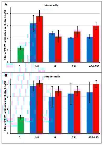 The concentration of VACV-specific IgG determined by ELISA in blood sera of mice intranasally (A) or intradermally (B) inoculated with LIVP, LIVP-GFP (G), LIVP-GFP-A34R* (A34), or LIVP-GFP-A34R*-dA35 (A34-A35) viruses at doses of 103 PFU (blue bars) or 105 PFU (red bars). C—control (blood sera of mice injected with saline).