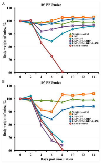 Non-immunized BALB/c mice and mice 30 days post-inoculation with LIVP, LIVP-GFP, LIVP-GFP-A34R*, or LIVP-GFP-A34R*-dA35R viruses were i.n. infected with cowpox virus (CPXV) strain GRI-90 [] at a dose of 56 LD50. The mice were individually weighed every 2 days, and were followed-up for survival for 14 days.
