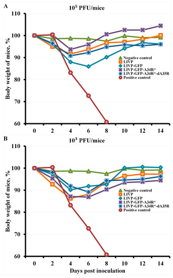 LIVP, LIVP-GFP, LIVP-GFP-A34R*, and LIVP-GFP-A34R*-dA35R viral preparations or saline were i.n. or i.d. inoculated into male and female BALB/c mice aged 3–5-weeks and weighing 13–16 g as described in []. The infective dose was 105 or 103 PFU/30 μL/animal. Each experimental and control group consisted of 6 animals. Each experiment was performed independently twice and similar results were obtained.
