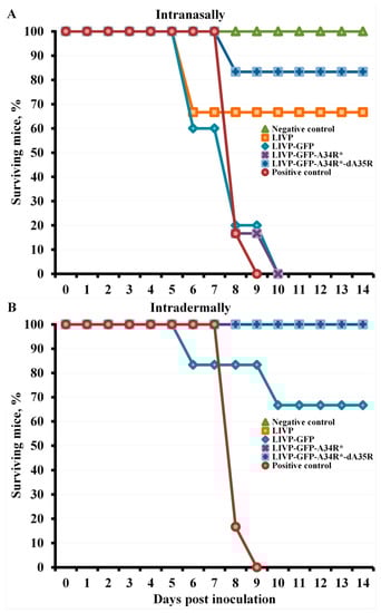 Changes in mortality of mice immunized intranasally (A) or intradermally (B) with LIVP, LIVP-GFP, LIVP-GFP-A34R*, or LIVP-GFP-A34R*-dA35R viruses at a dose of 103 PFU/animal after their intranasal inoculation with CPXV GRI-90 at a dose of 56 LD50 on day 30 of the experiment.