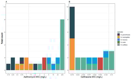 Distribution of the MICs (mg/L) of azithromycin (A) and ceftriaxone (B) by species in the complete panel of 26 isolates. Dotted line indicates EUCAST breakpoint for N. gonorrhoeae (epidemiological cut-off values (ECOFF) for azithromycin) and species are coded by color.