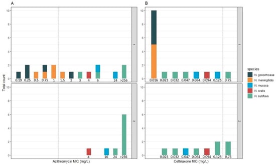 All colonies with a morphology compatible with Neisseria were subcultured. Gram staining and oxidase test were performed, and Neisseria species were identified by matrix-assisted laser desorption/ionization—time of flight mass spectrometry (MALDI-TOF–MS). Minimum inhibitory concentrations (MICs) of ceftriaxone and azithromycin were determined by E-test. EUCAST breakpoints for N. gonorrhoeae were used to define the reduced susceptibilities of all the Neisseria species in the panel (azithromycin (AZM) resistant (R) >1 mg/L (ECOFF); ceftriaxone (CRO) resistant (R) ≥0.125 mg/L) [].