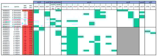 In the pathogenic Neisseria, the following 10 RAMs were found: mtrD K823E/S (3/10), mtrR A39T (3/10), mtr promoter (3/10), penA I312M (1/10), penA V316T (1/10), penA A51V (1/10), penA N513Y (1/10), penA A517G (5/10), porB G120K/A121N (1/10) and porB Δ121 (5/10; Figure 3).