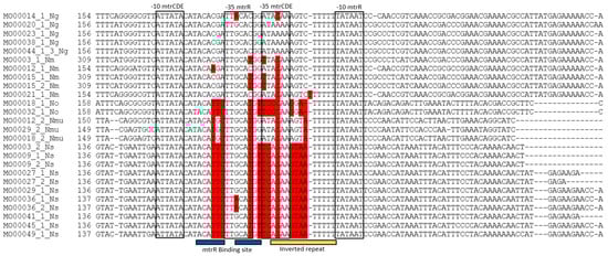 Fragment of alignment of the mtr promoter region with mtrR and mtrCDE promoter sites (black box), mtrR binding site (blue bar) and inverted repeat (yellow bar). SNPs in the promoter and binding site compared to the N. gonorrhoeae wild type are colored in red. (Strain number with species; N. gonorrhoeae (Ng), N. meningitidis (Nm), N. oralis (No), N. mucosa (Nmu) and N. subflava (Ns)).