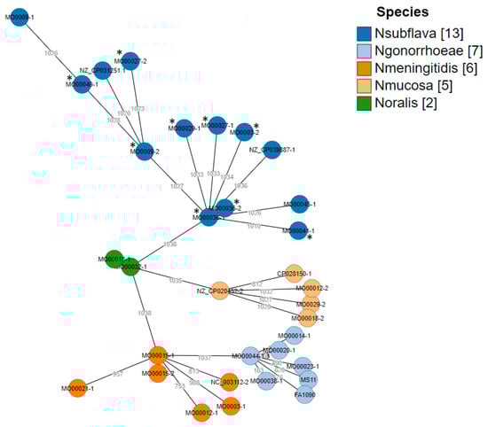 Gene-by-gene analysis was carried out wherein, the core allelic profiles (scheme) of the study strains (n = 26) along with seven reference genome sequences (N. subflava (n = 2), N. gonorrhoeae (n = 2), N. meningitidis (n = 2), N. mucosa (n = 1) from National Center for Biotechnology Information (NCBI), were analyzed using (ChewBBACA) []. Minimum spanning tree algorithm (MSTree V2) implemented in Grapetree was used to visualize the core genome MLST (cgMLST) allelic loci differences [].