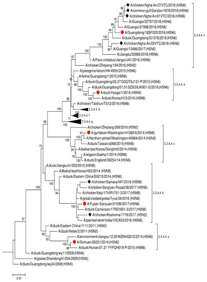 - Bi, Y.; Chen, Q.; Wang, Q.; Chen, J.; Jin, T.; Wong, G.; Quan, C.; Liu, J.; Wu, J.; Yin, R.; et al. Genesis, Evolution and Prevalence of H5N6 Avian Influenza Viruses in China. Cell Host Microbe 2016, 20, 810–821. [Google Scholar] [CrossRef] [PubMed]