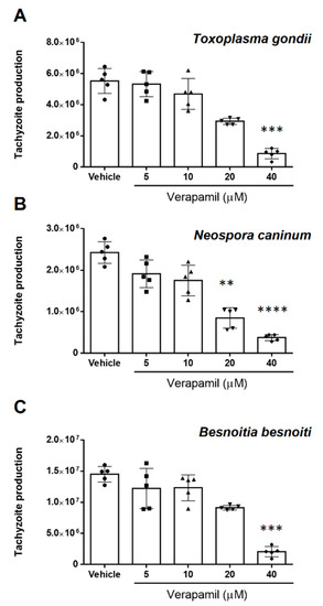 Verapamil treatment reduces T. gondii, N. caninum and B. besnoiti tachyzoite proliferation in a dose-dependent manner. The hosts cells pre-treated with verapamil (5, 10, 20 and 40 μM) were infected with T. gondii (A), N. caninum (B) or B. besnoiti (C) tachyzoites in inhibitor-free medium for 4 h, followed by the compound re-administration. At 48 h after infection, the number of tachyzoites present in cell culture supernatants were counted. Bars represent means of five biological replicates ± standard deviation.