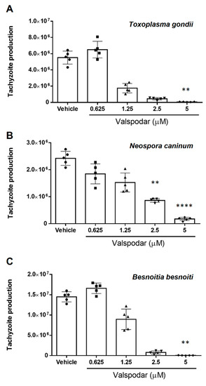 Valspodar treatment induces a dose-dependent effect on T. gondii, N. caninum and B. besnoiti proliferation. The host cells pre-treated with valspodar (0.625, 1.25, 2.5 and 5 µM) were infected with T. gondii (A), N. caninum (B) or B. besnoiti (C) tachyzoites in inhibitor-free medium for 4 h, followed by the compound re-administration. At 48 h after infection, the number of tachyzoites present in cell culture supernatants were counted. Bars represent means of five biological replicates ± standard deviation.